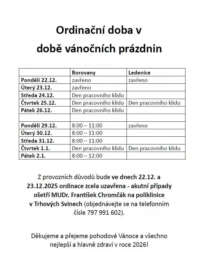 věnujte prosím pozornost změně ordinační doby v období vánočních prázdnin 2025.